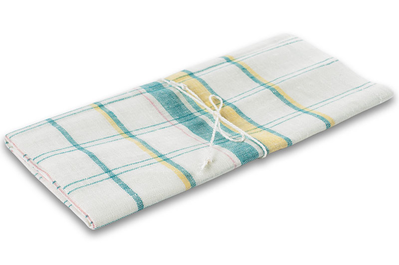 • pellava keittiöpyyhe, valkoinen vihreillä keltaisilla ruuduilla