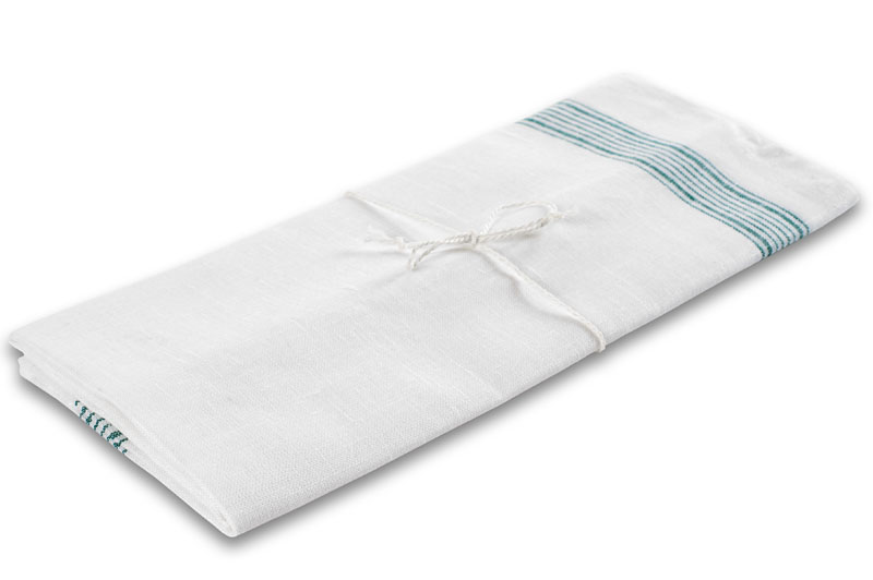 • pellava keittiöpyyhe, valkoinen vihreillä raidoilla