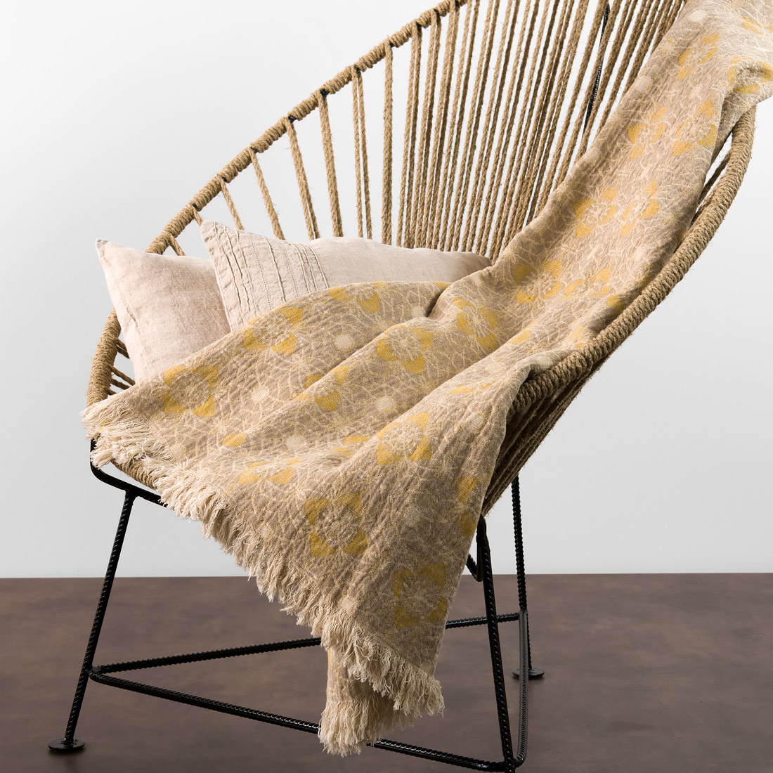 • FLORE puolipellava huopa sinapinkeltainen, kaksipuolinen, kukkakuvio, jacquard