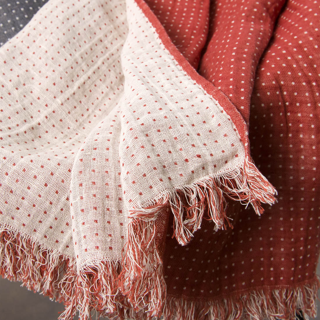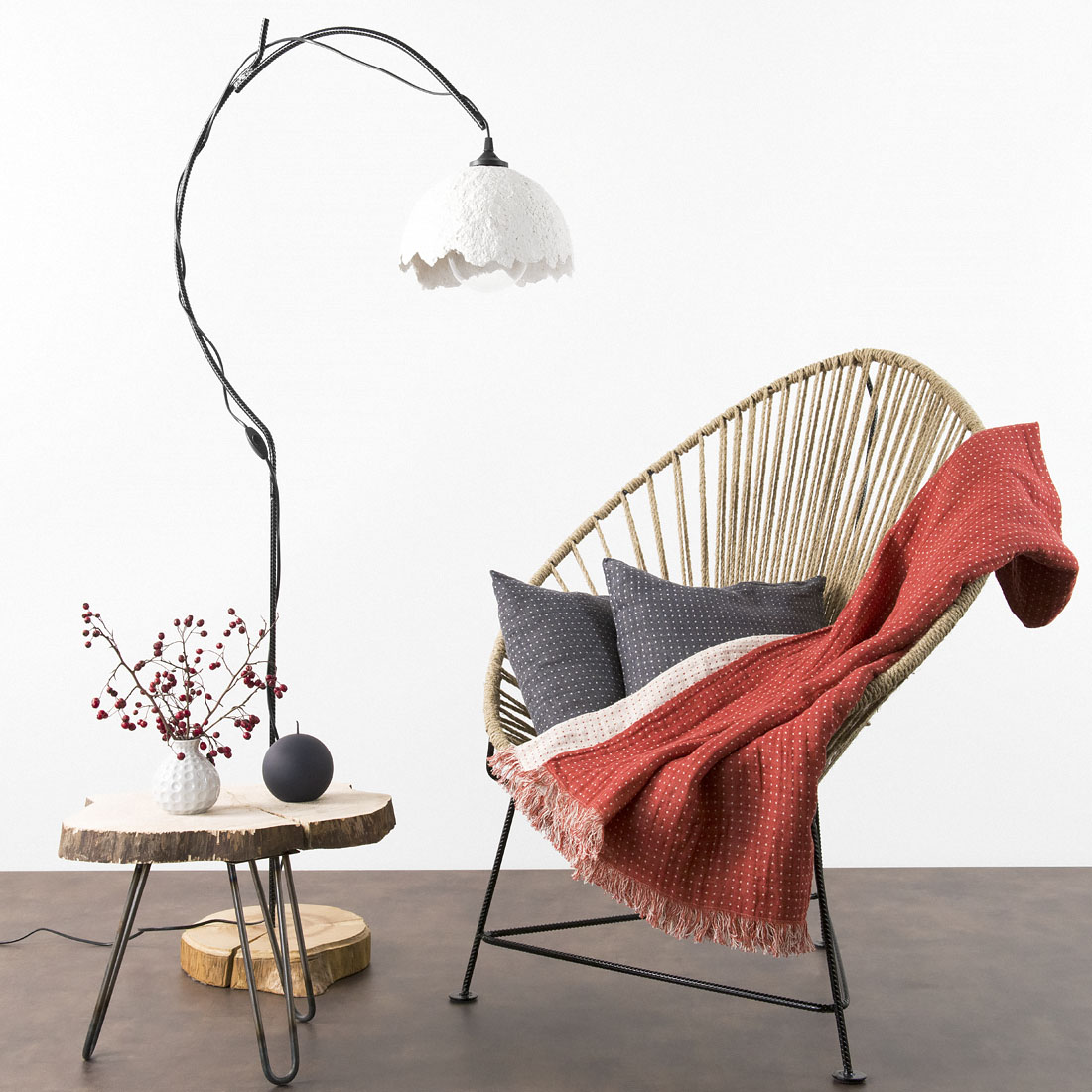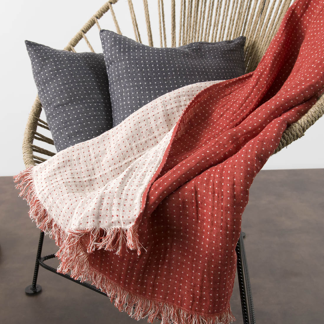 - Väri: kudottu vanilja (kellertävä), vaalea kerma, granaatinpunainen ja tiilenpunainen lanka