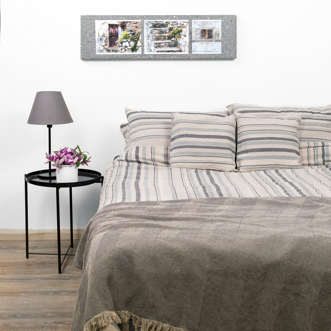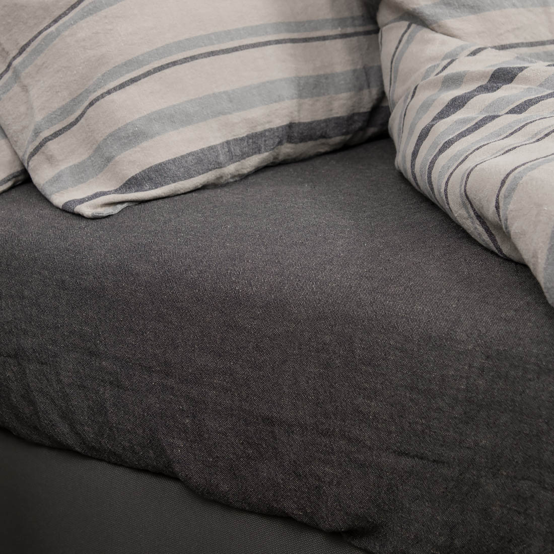 - Makeiset: Beige - harmaa raidallinen pussilakana, jonka alaosassa on piilotettu nappisuljenta; Beige - harmaa raidallinen tyynyliina läpällä; Beige - musta melange muotoonommeltu lakana joustava; Beige - musta melange lakana - yksinkertainen helma.