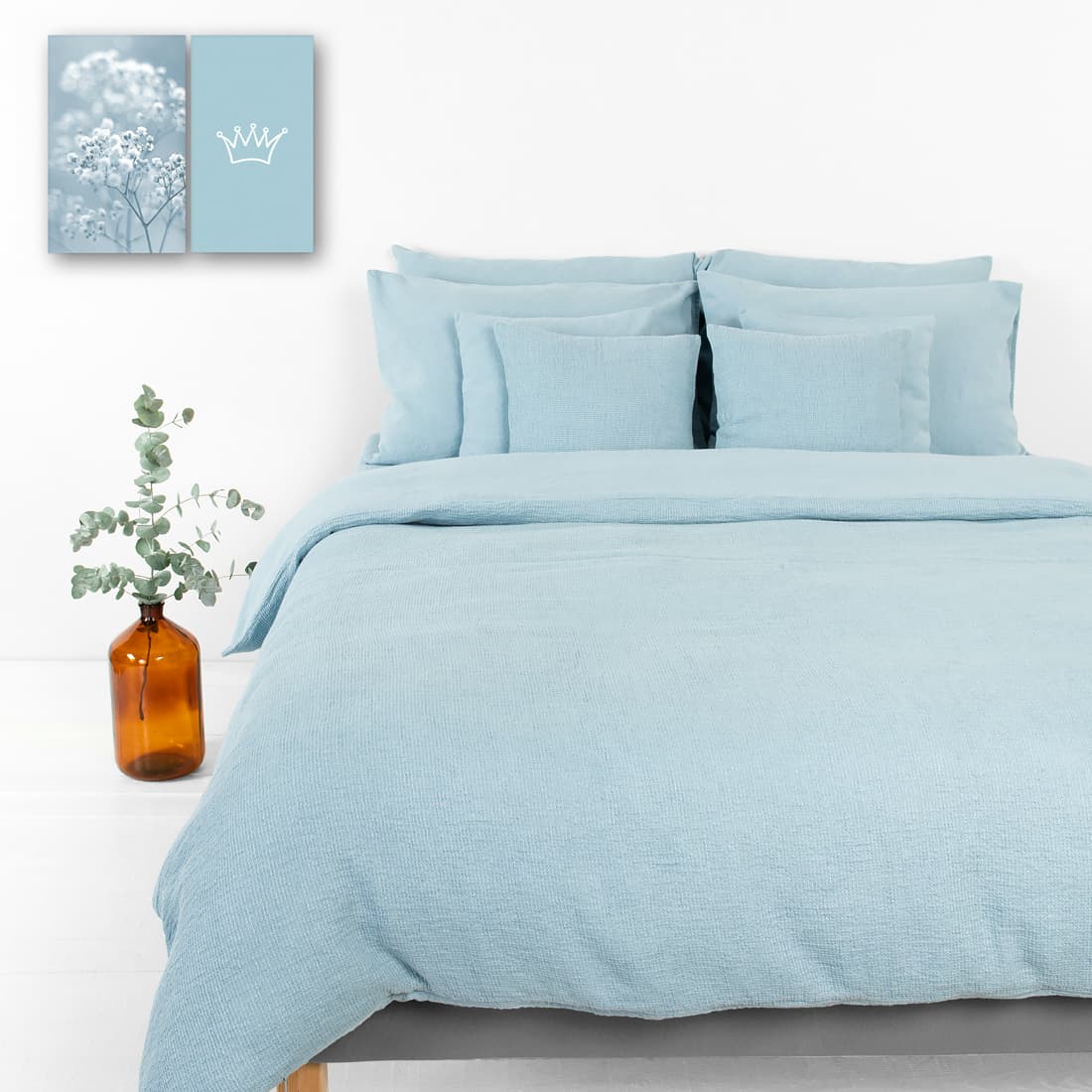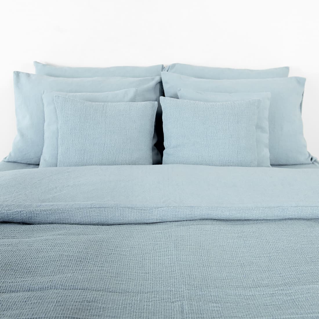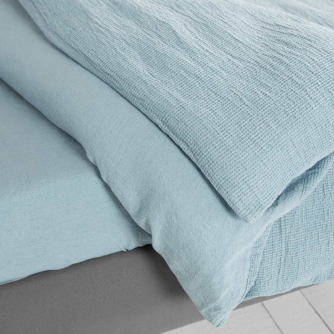 - Makeiset: Pussilakana, jossa on vetoketju alareunassa, kaksipuolinen: toinen puoli sileää kudosta, toinen vohvelipiquéa; Tyynyliina tavallinen läpällä; Muotoonommeltu lakana joustava; Lakana - yksinkertainen helma.