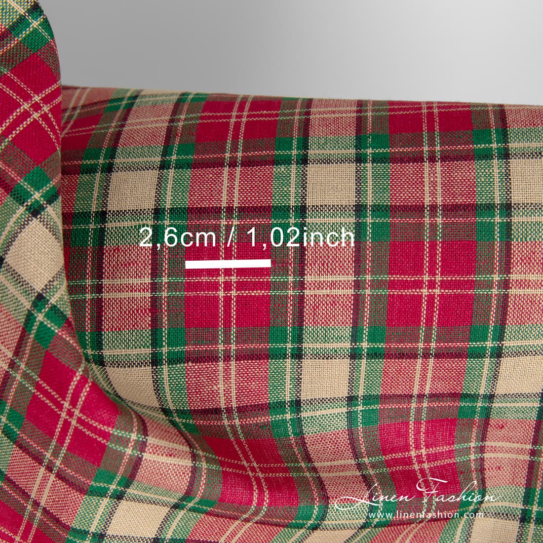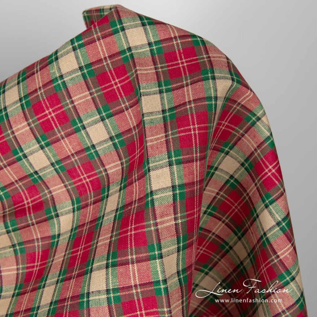 Pellavapuuvillakangas beigeillä ja punaisilla ruuduilla