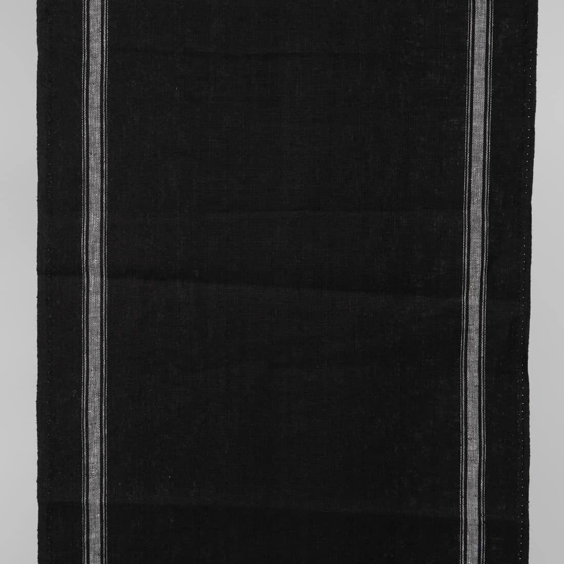 / Musta pellavainen keittiöpyyhe jossa on valkoisia raitoja reunoilla