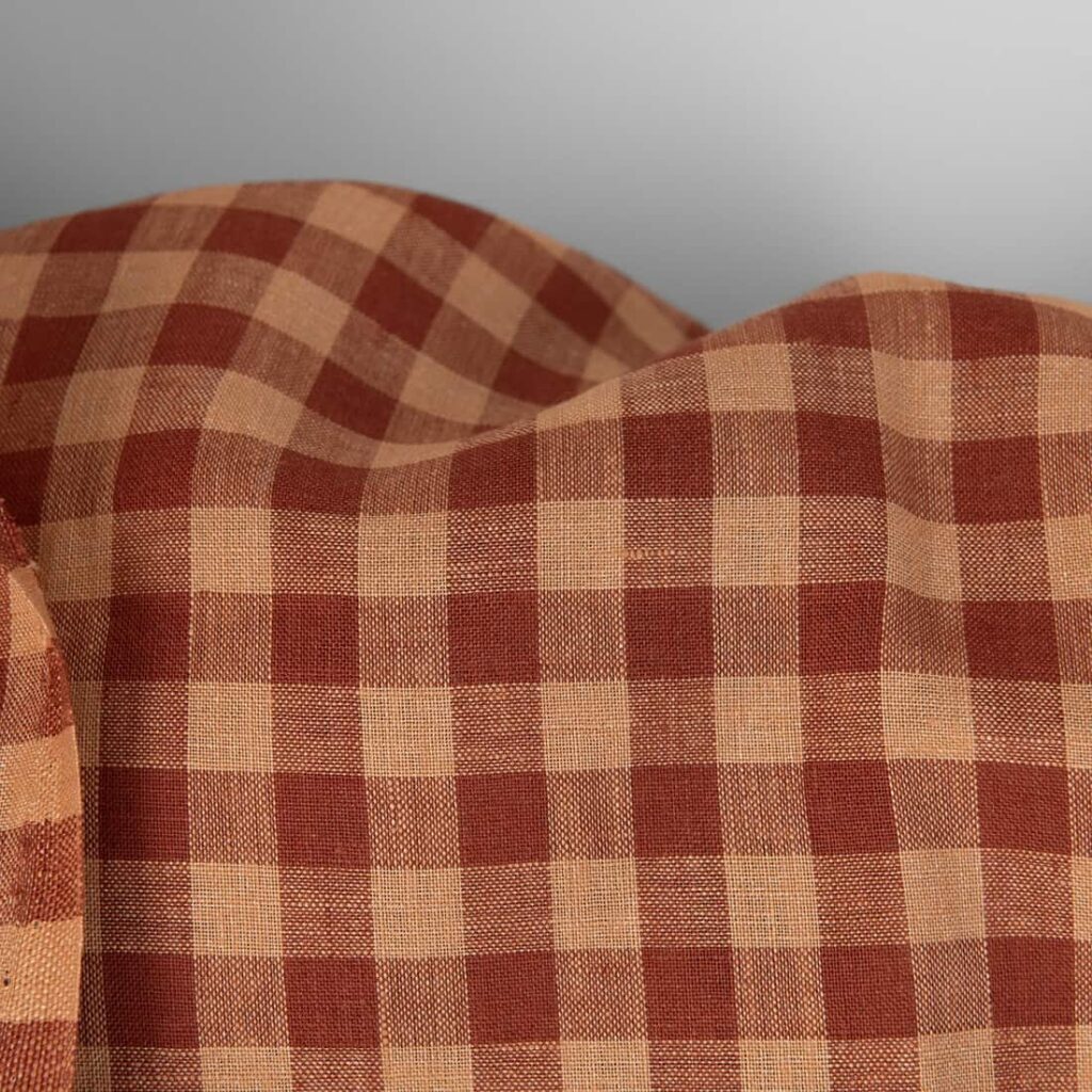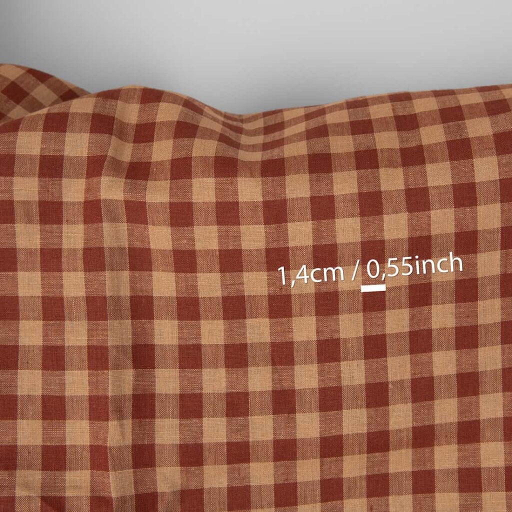 Pellavakangas karamellin ja lämpimän ruskean sävyisillä ruuduilla määrä