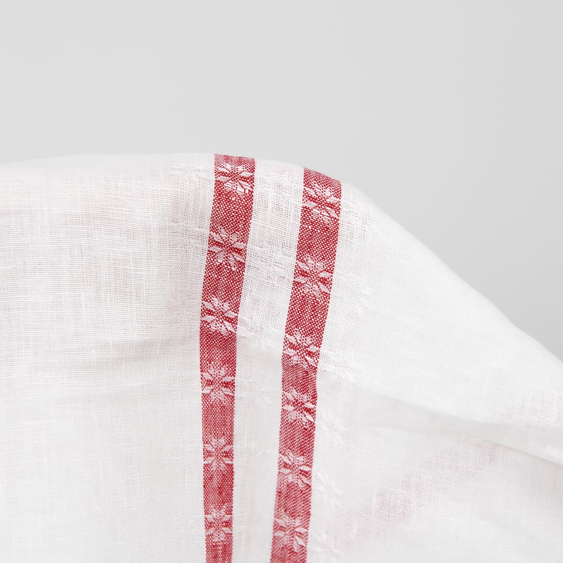 Valkoinen pellavakangas punaisilla viivoilla