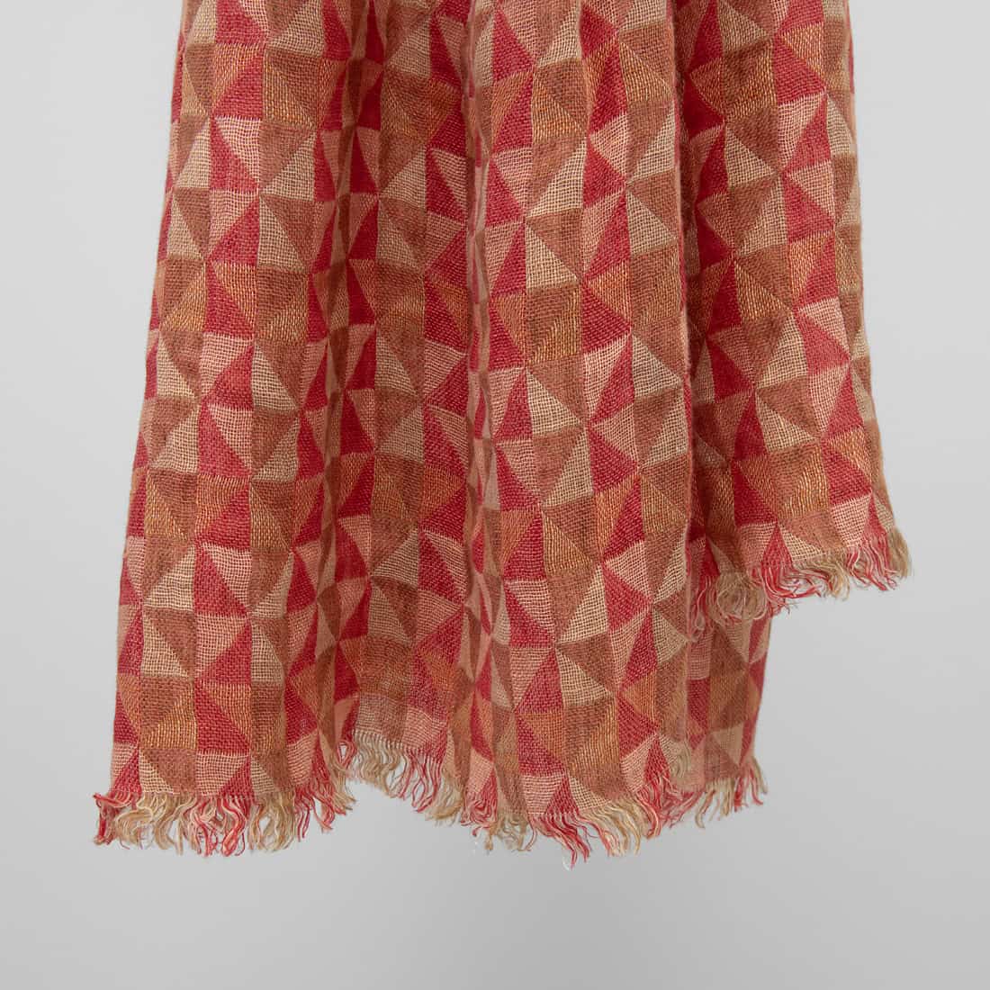 - Väri: sekoitus tulipunaisia, nudeja, kanelinruskeita, tumman hiekan värisiä, persikanvärisiä ja vehnänkeltaisia lankoja