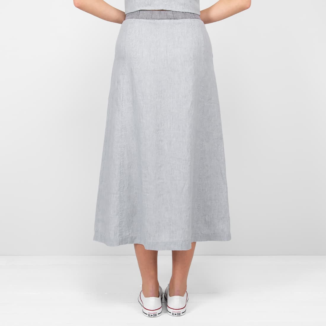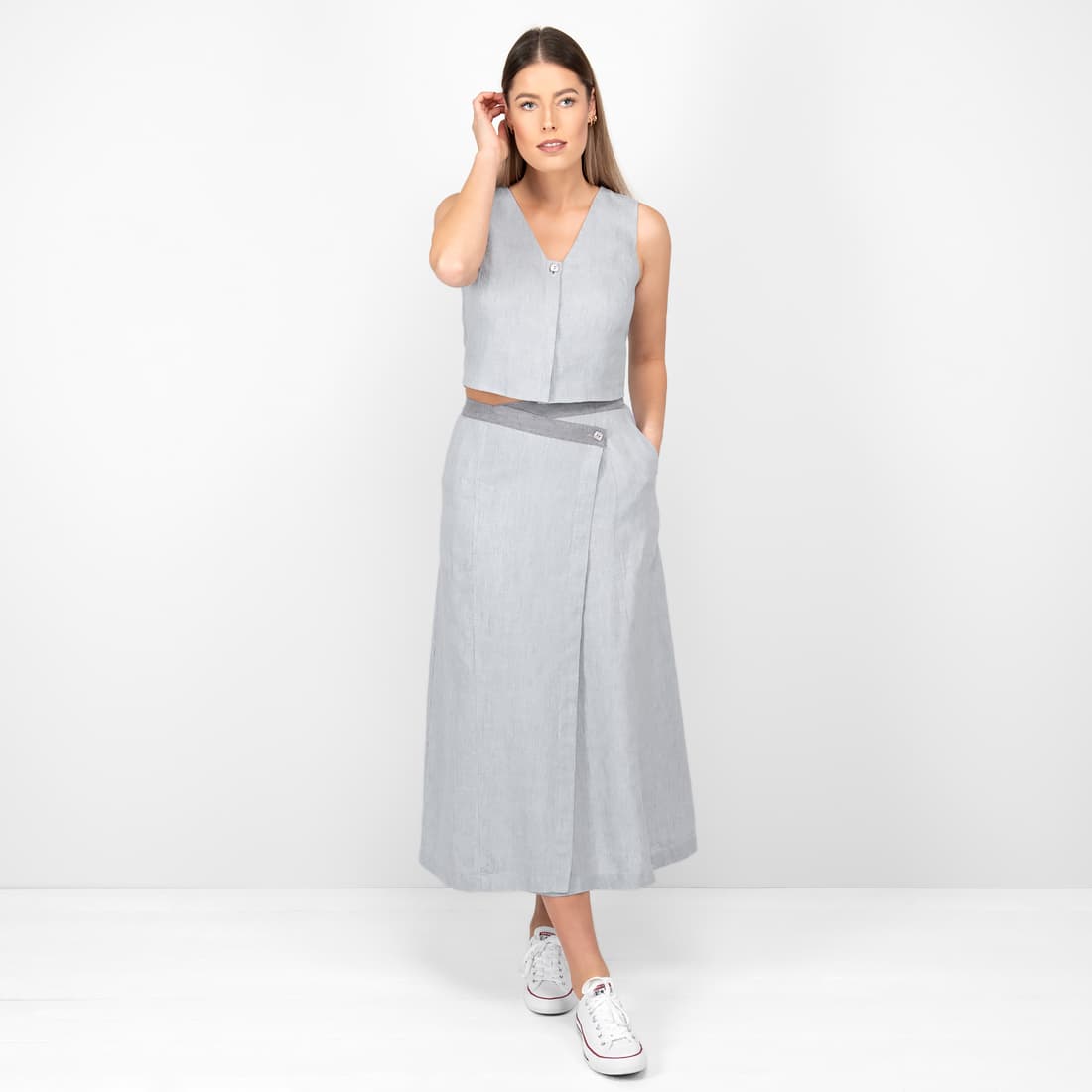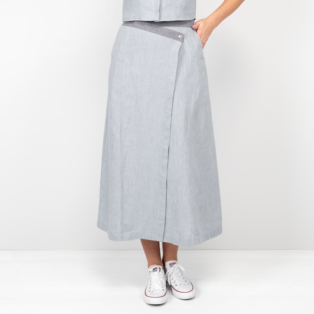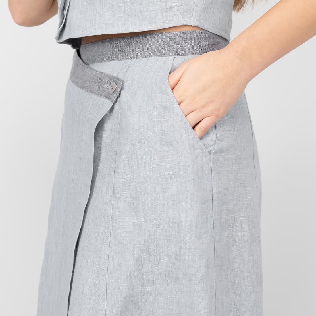 Yksityiskohdat: vyötärönauha harmaa-violettia kirjavaa kangasta, taskut, koristeellinen nappi edessä