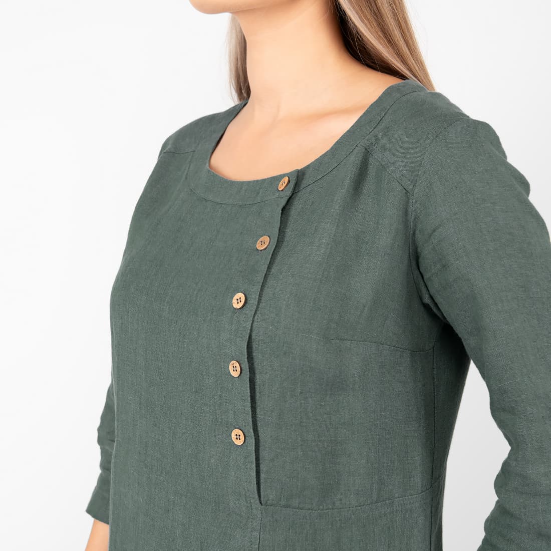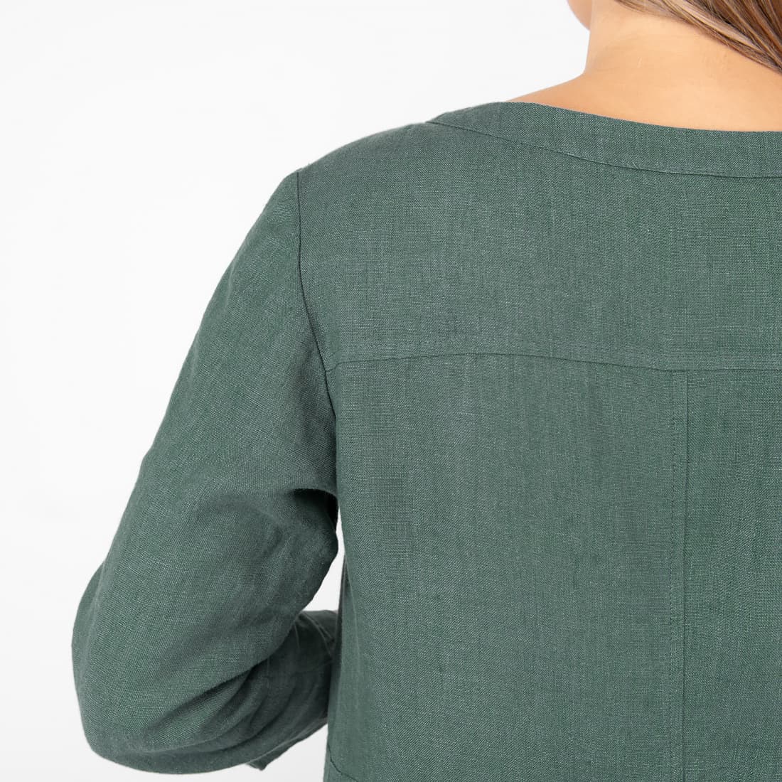 • Yksityiskohdat: Pyöreä pääntie; epäsymmetrinen nappikiinnitys edessä; sivutaskut;