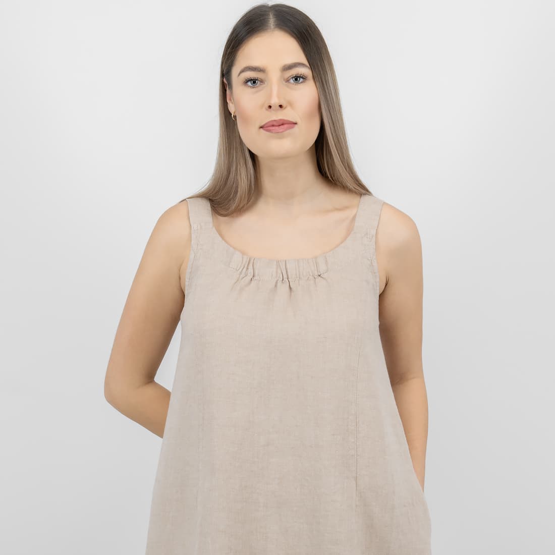 • MINA ruskehtava pellava mekko, pyöreä pääntie, hieno kertaus pääntieosassa edessä ja takana