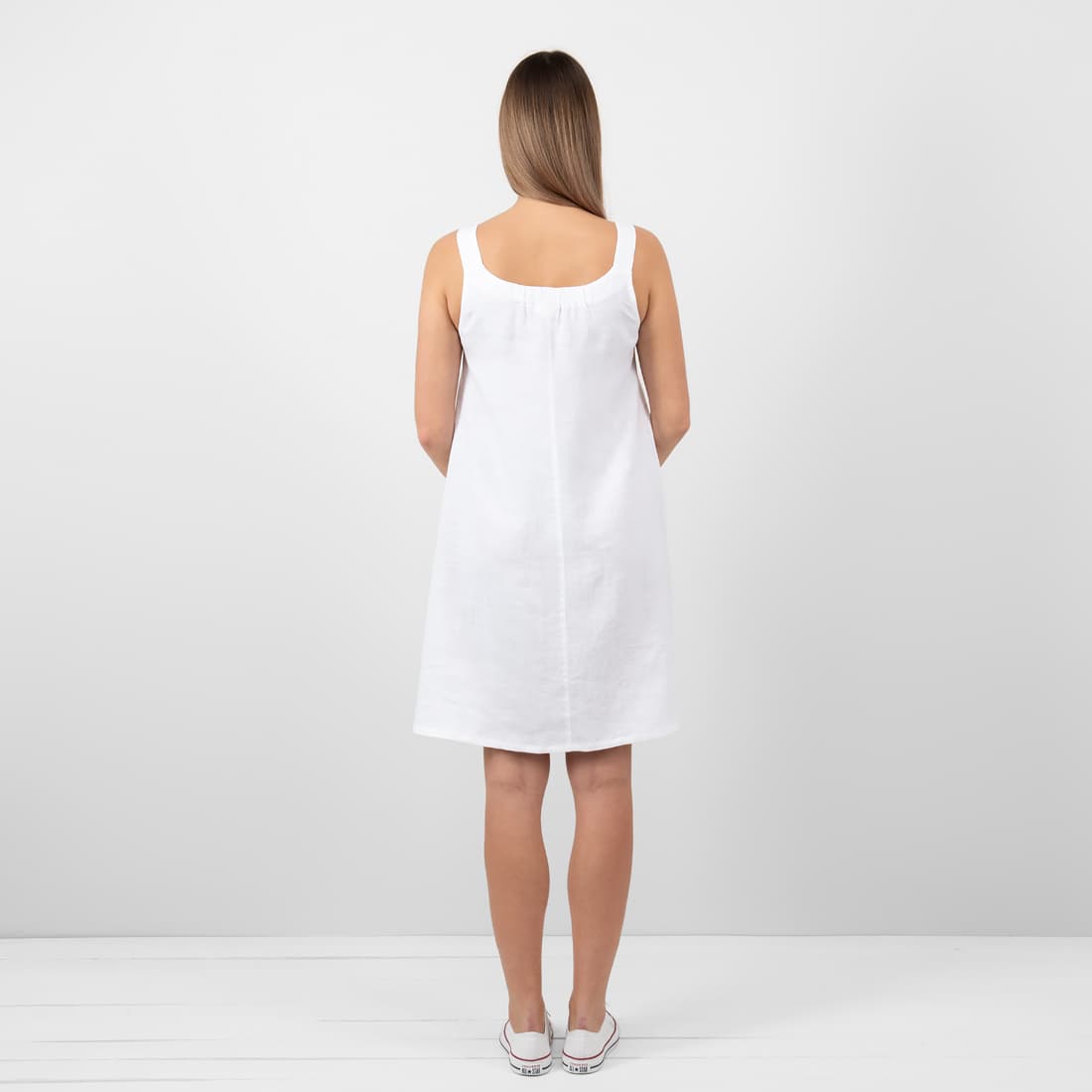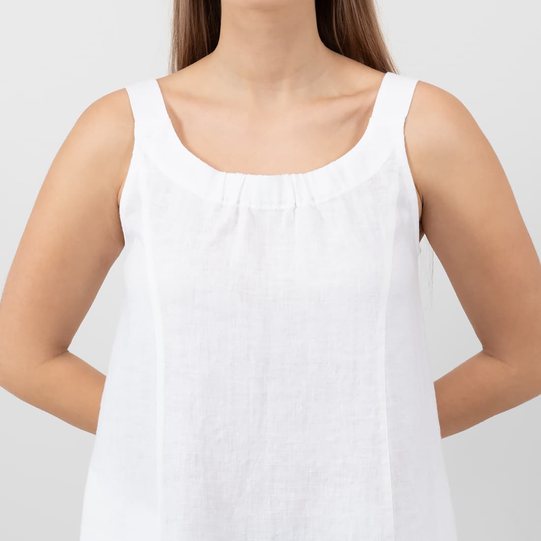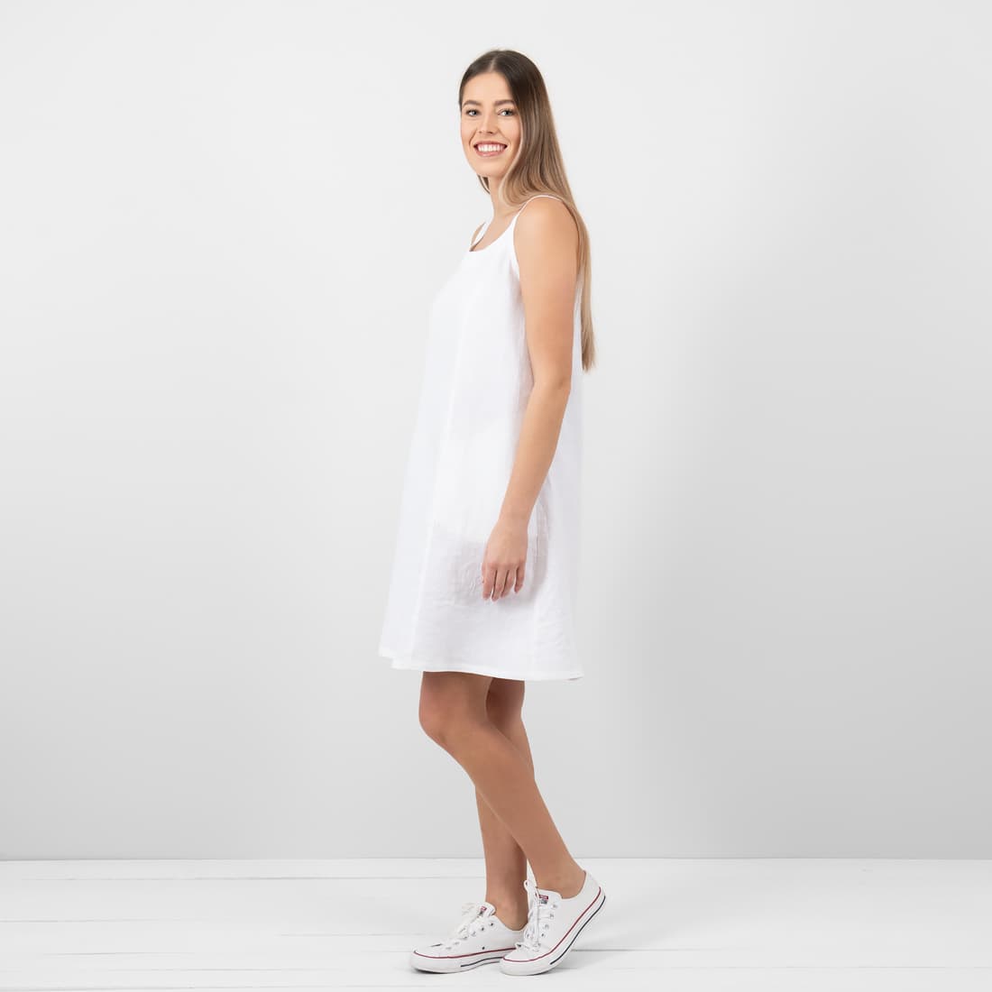 • MINA valkoinen pellava mekko, jossa on leveät olkaimet