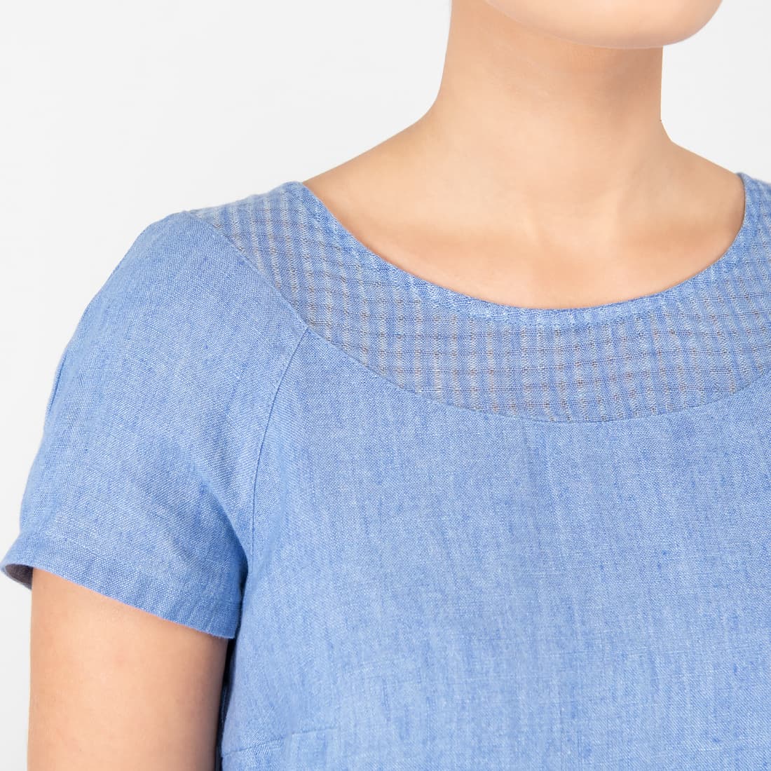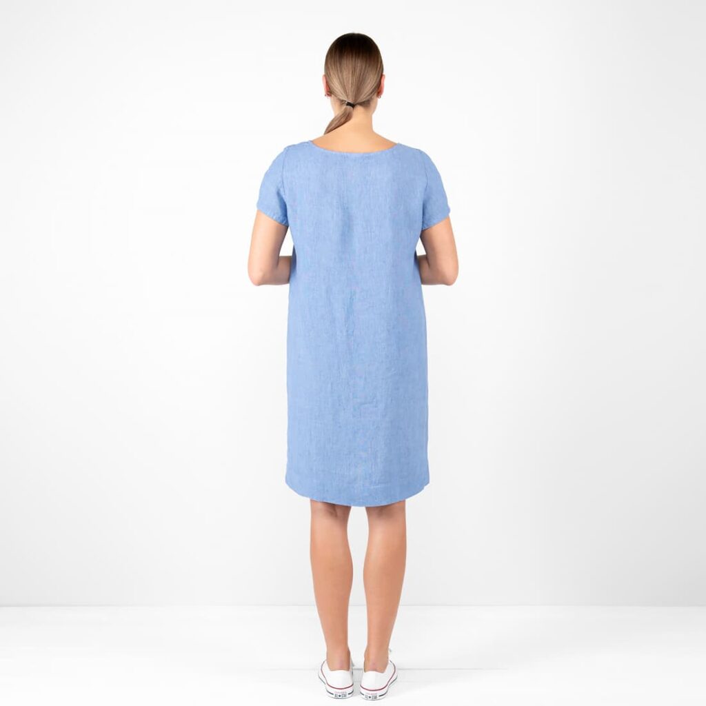- Tuotemalli: suora siluetti, väljä istuvuus, polven yläpuolelle ulottuva pituus, lyhyet hihat