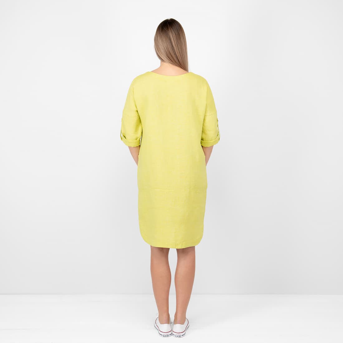 • VILI keltainenvihreä pellavamekko, pyöreä pääntie, 3/4-hihat, joissa on napit