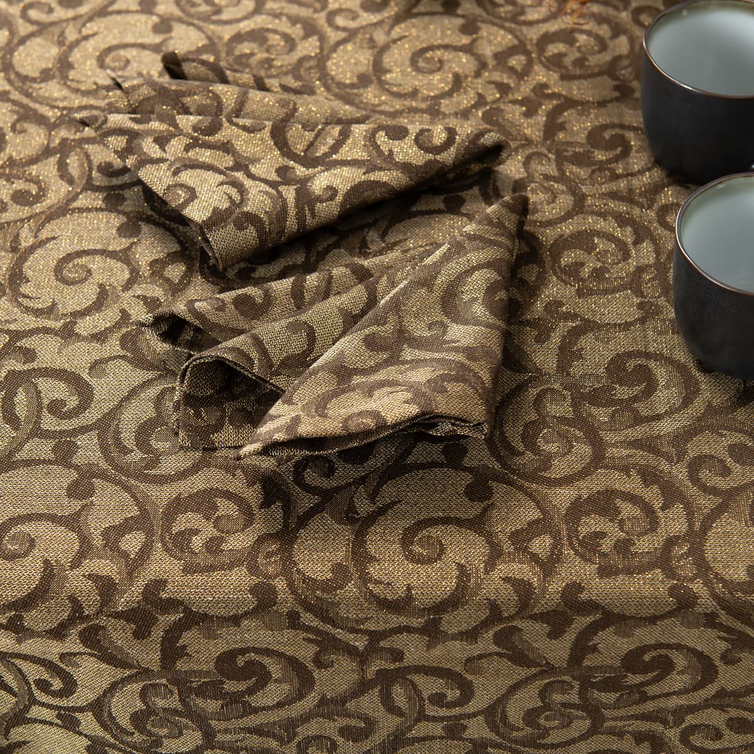 - Väri: kudottu tummanruskea puuvilla, luonnonvärinen (värjäämätön, ruskeanharmaa) pellava ja kultainen polyesterilanka