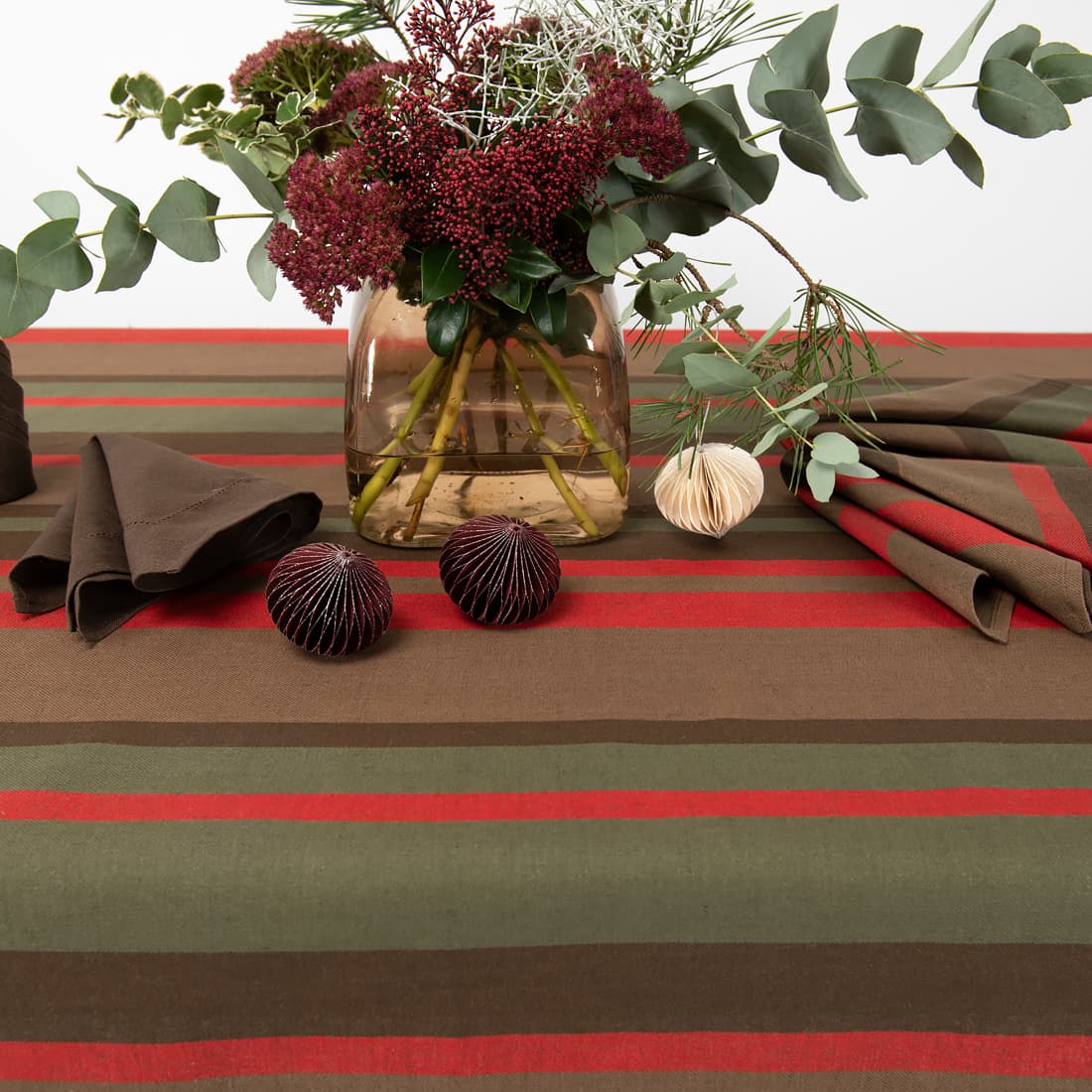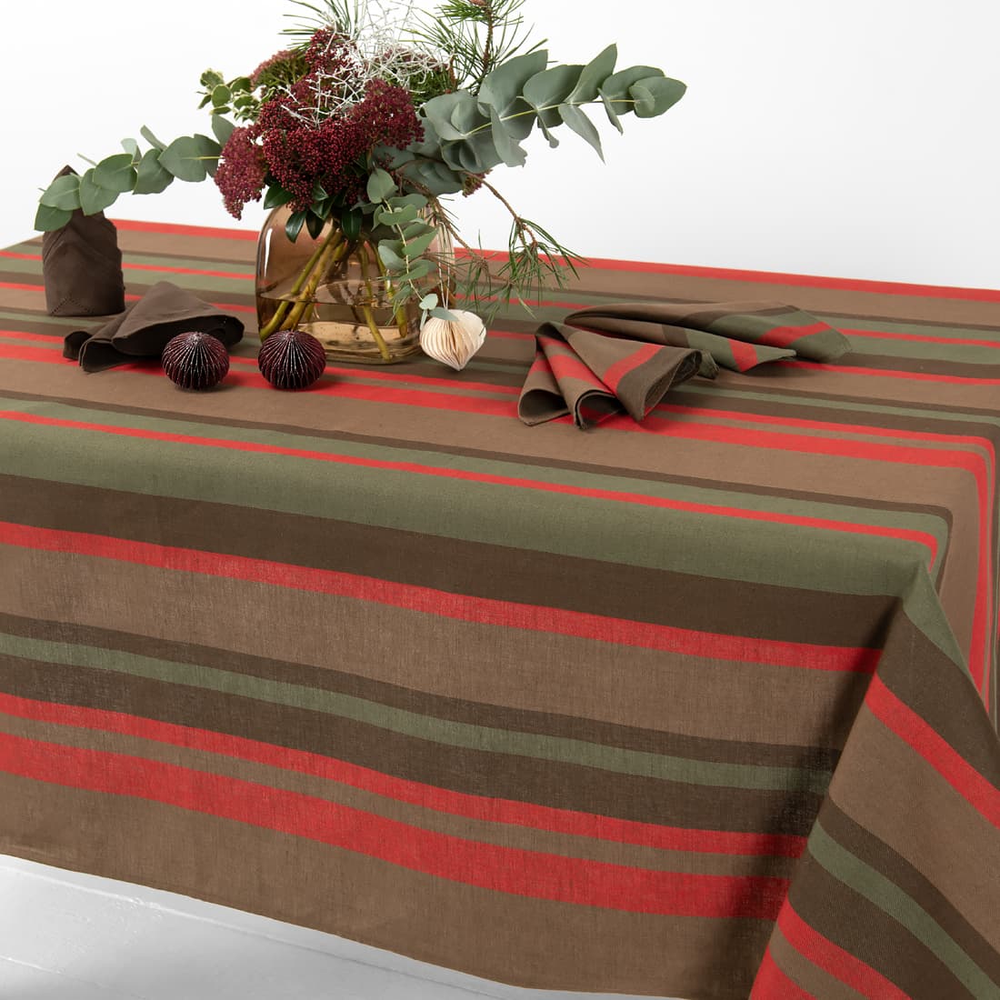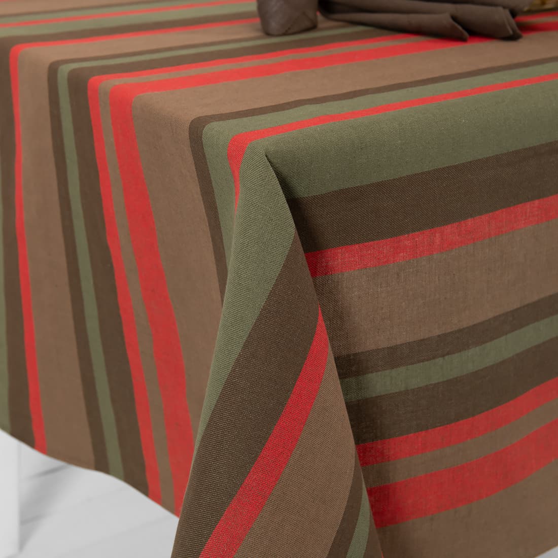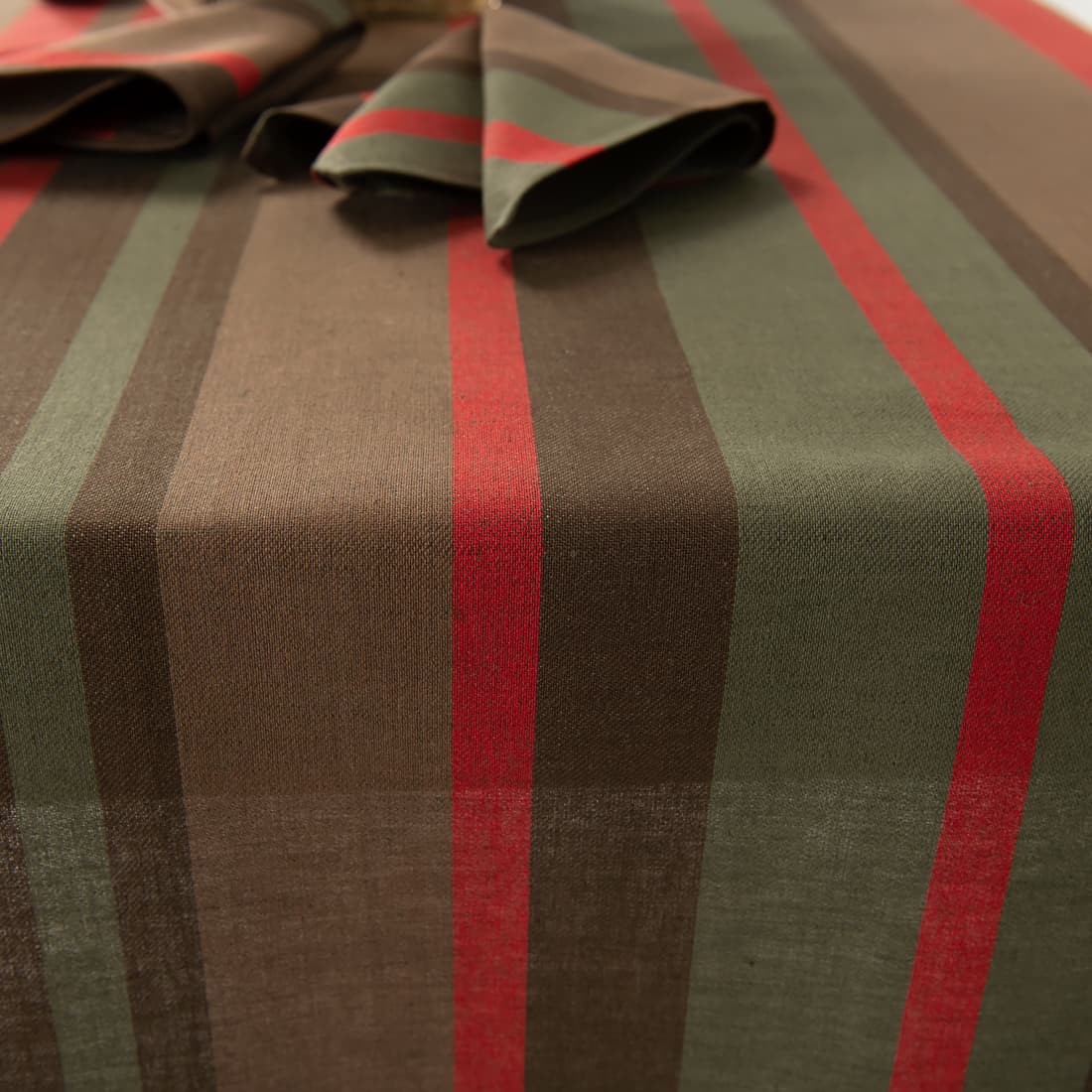 • Puolipellava pöytäliina raitoja, harmaanruskeaa, ruskeaa, punaista ja tummanvihreää lankaa, jotka on kudottu yhteen