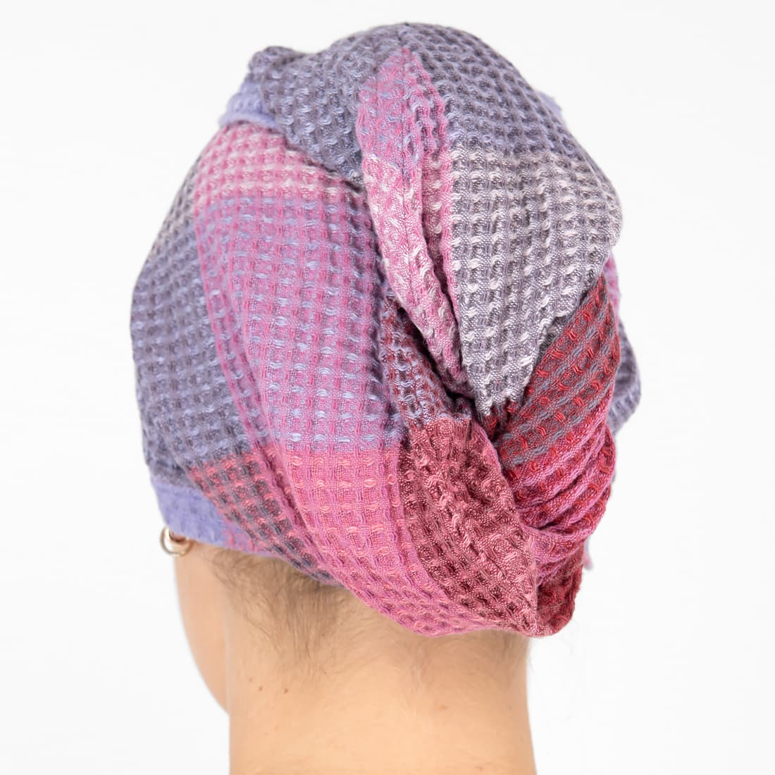 - Väri: sekoitus punaisen, violetin ja vaaleanpunaisen värisiä lankoja.