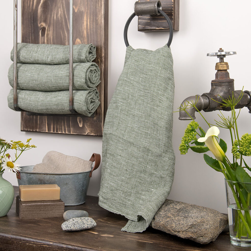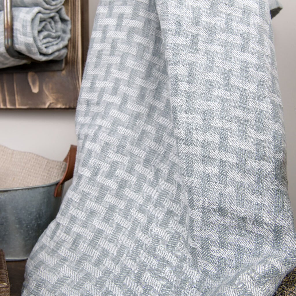 Pellavainen kylpypyyhe siniharmaan värisenä. Tämä pyyhe on pehmeä, sillä se on valmistettu pestystä pellavakankaasta. Piristä kylpyhuonettasi ylellisen näköisellä pyyhkeellä.