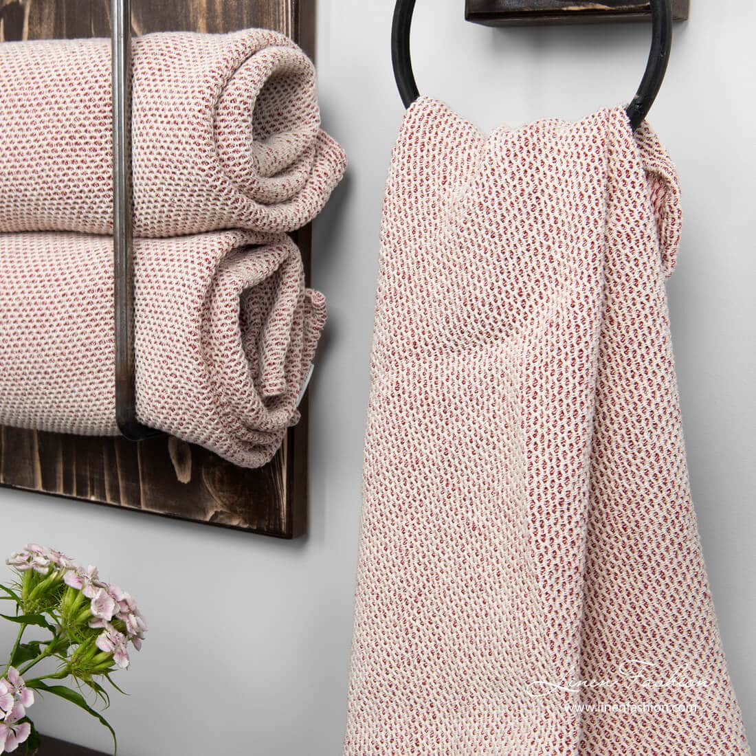 - Väri: sekoitus luonnonvalkoista (kellertävänvalkoista) ja viininpunaista värisiä lankoja