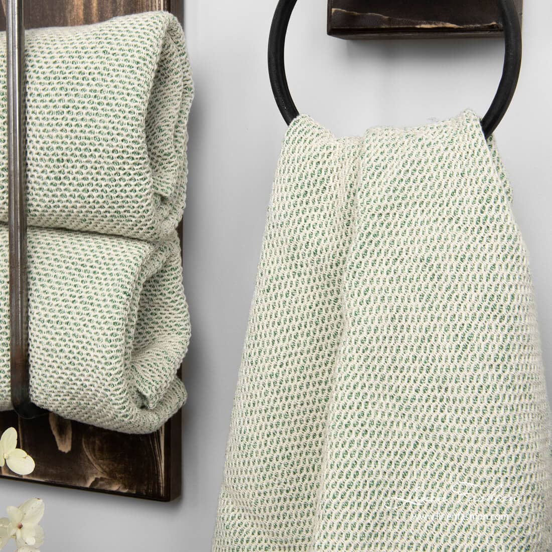 - Väri: sekoitus luonnonvalkoisia (kellertävänvalkoisia) ja kuusenvihreitä lankoja