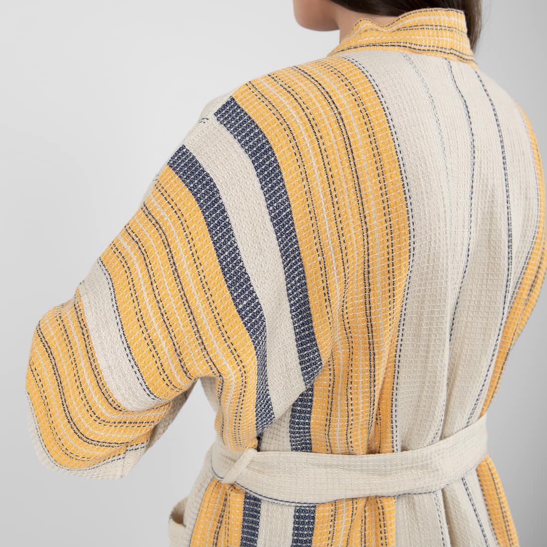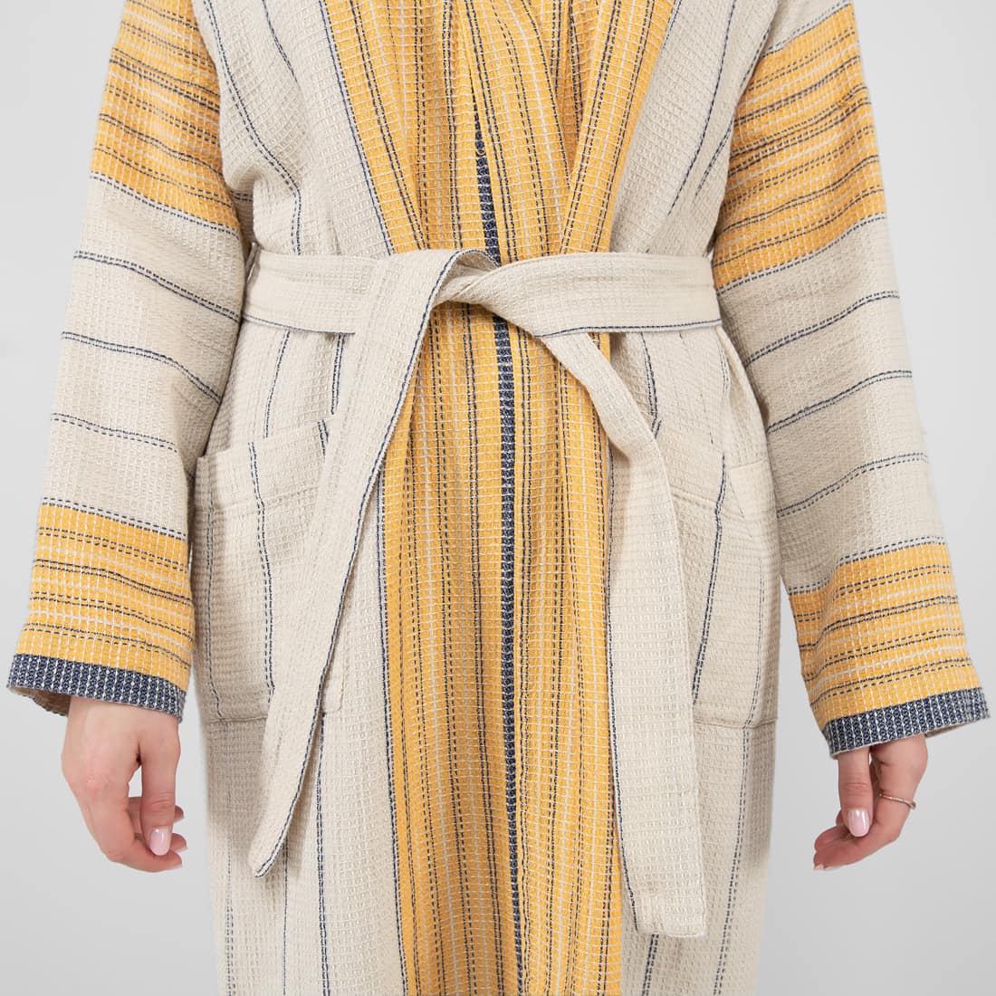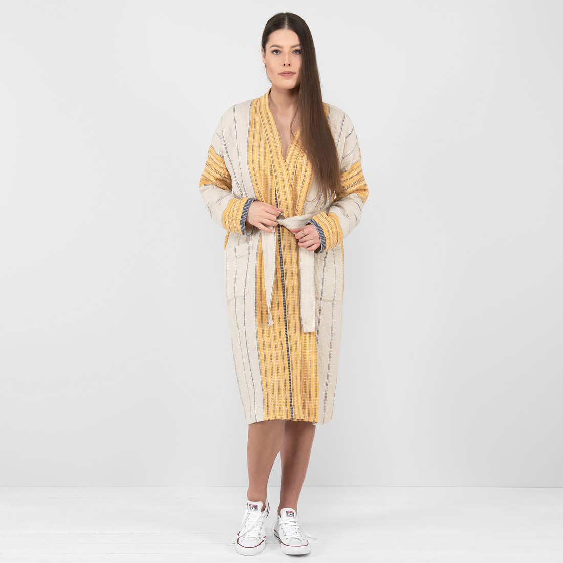 • pellava puuvillabeige raidallinen kylpytakki keltaisensininen.
