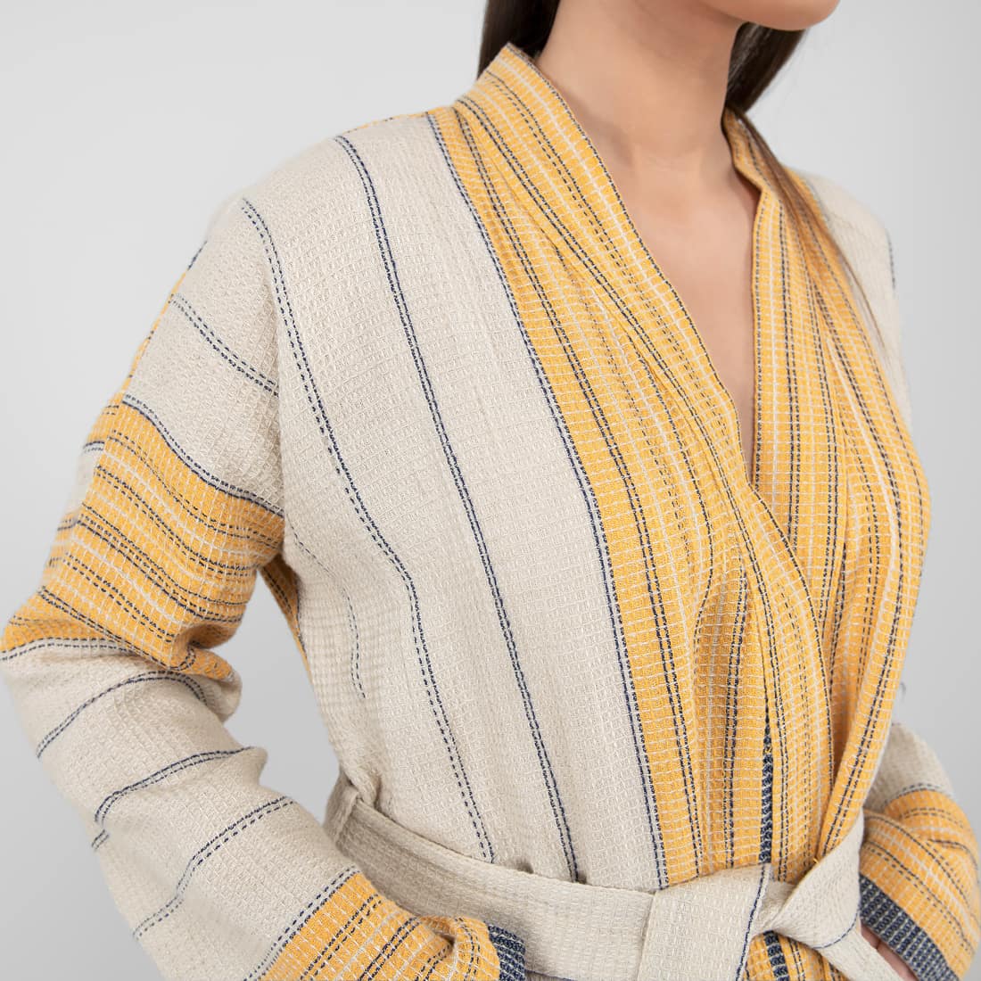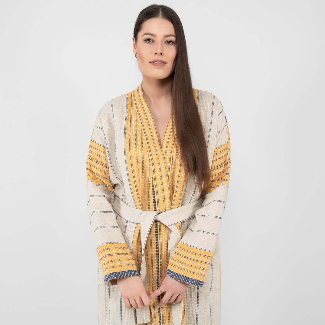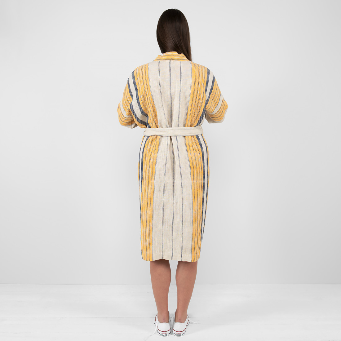 • pellava puuvillabeige raidallinen kylpytakki keltaisensininen.