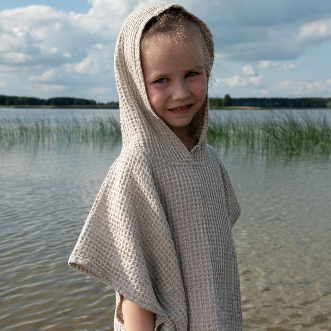 • Puolipellava poncho beige vohvelipiqué, jossa on sivuhalkiot
