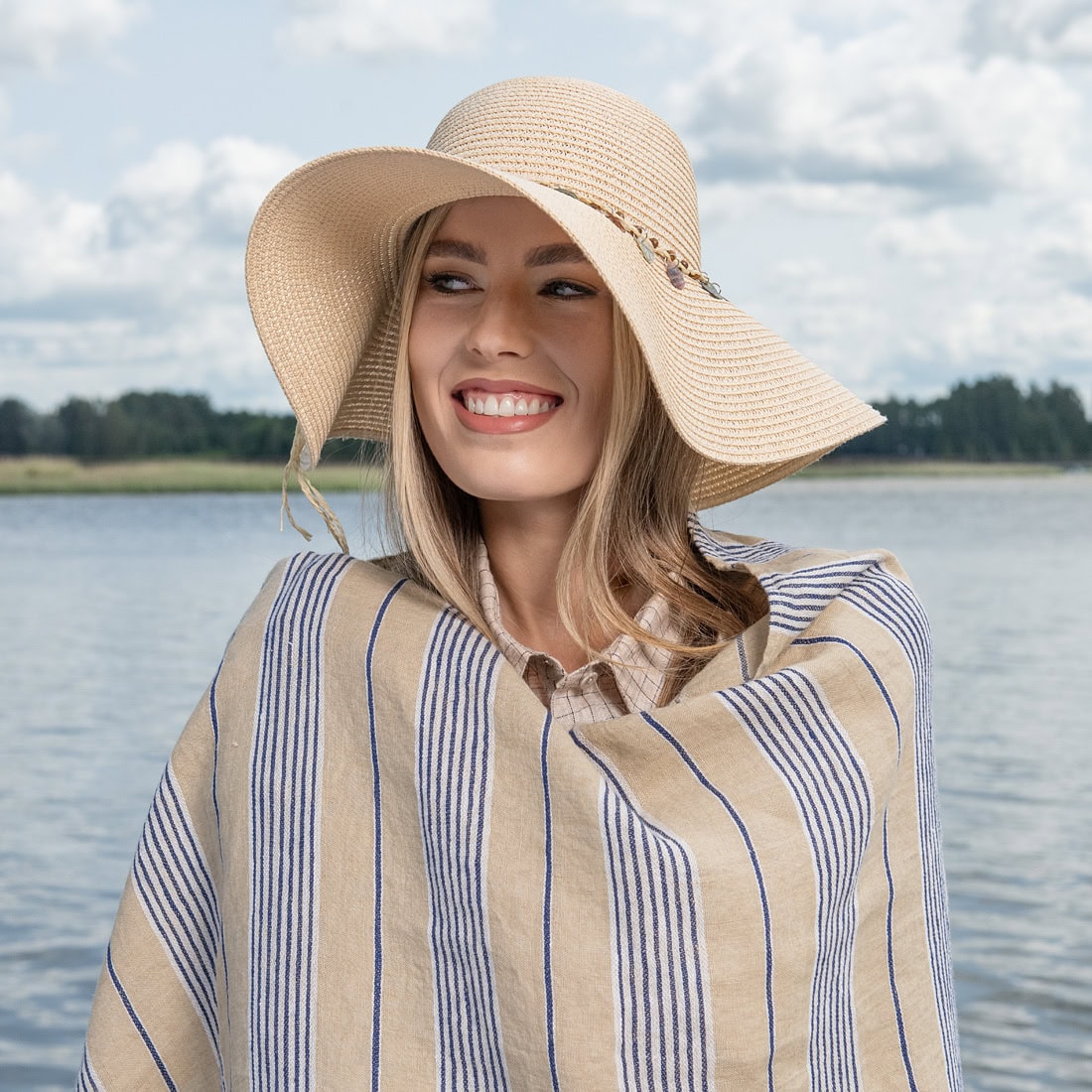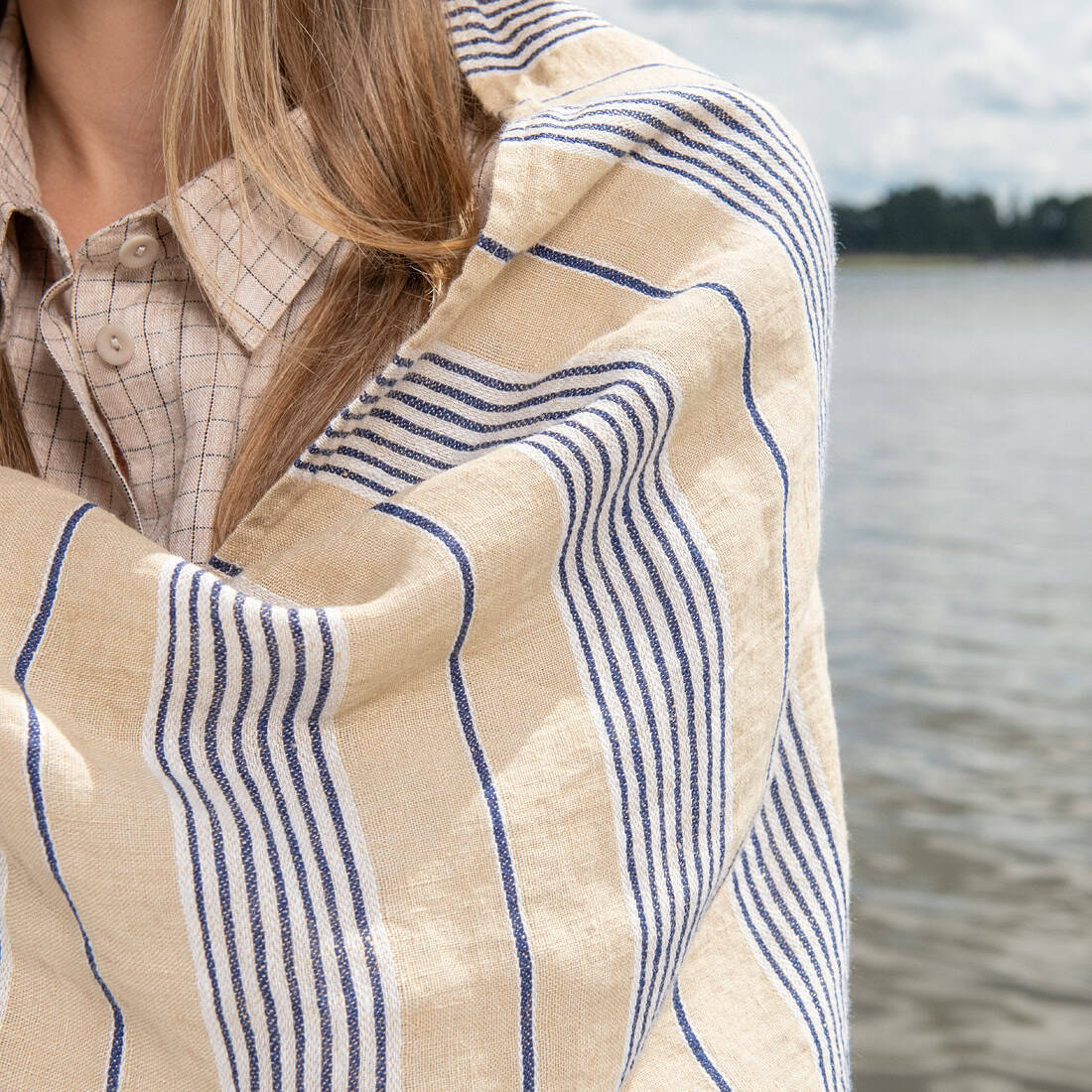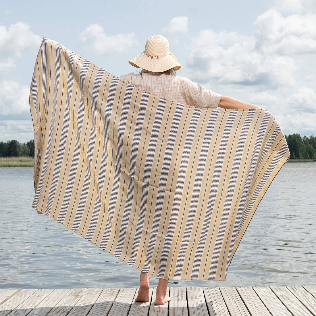 • Pellava rantapyyhe sininen raidallinen kellertävän ruskealla pohjalla