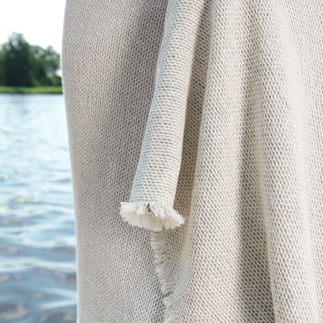 - Väri: luonnonvalkoisten (kellertävänvalkoisten) ja siniharmaiden lankojen sekoitus.
